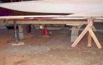 I had the motor and drive off my boat when I done it and that is why you see my stand frame so far forward, but if you plan on doing the job with the motor still in the boat, the stands will not have to be so far forward. Ton can put a pice of tape on each side of the hull, about the middle of the trailer fenders, as a refference point to place the stands.